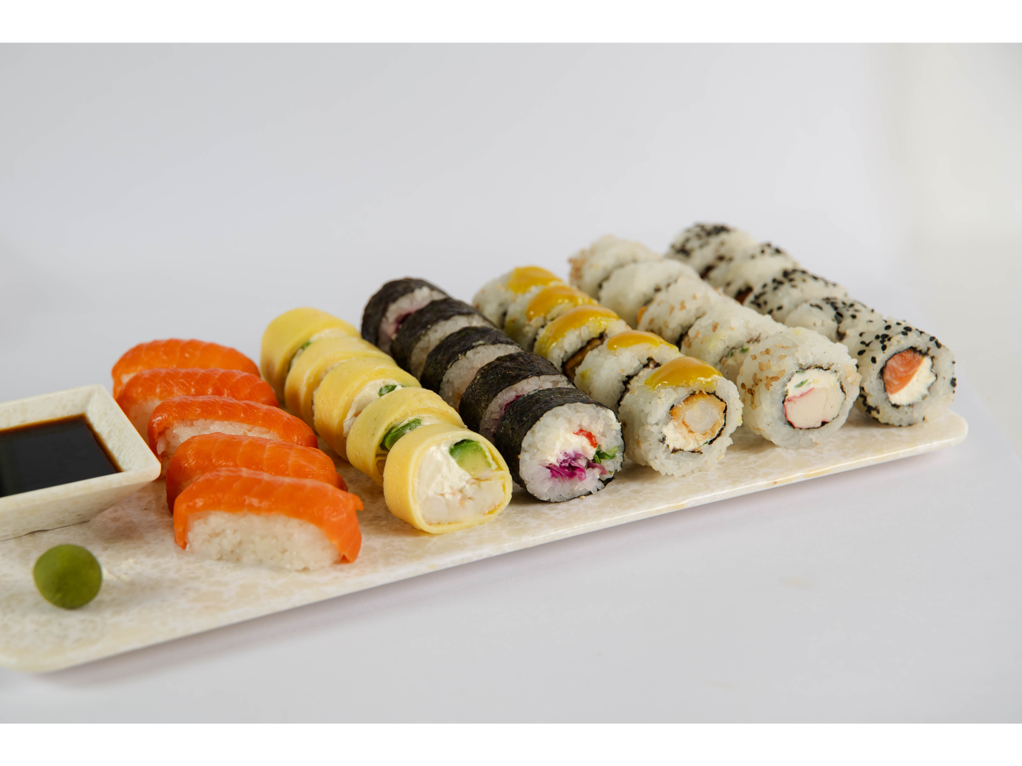 WHITE > 30 piezas a tu elección Compartir por WhatsApp Copiar enlace 30 Piezas a elección con salsa wasabi y palitos incluidos. Imagen a modo ilustrativo.$38.500Precio sin impuestos: $31.818 Personalizá tu selección Las siguientes opciones aplican para cada producto agregado. Piezas White 30 Seleccioná 6 opciones. Obligatorio New York (5 piezas) Salmon trout y palta. New York Phila (5 piezas) Salmon trout , palta y queso Philadelphia. Philadelphia (5 piezas) Salmon trout y queso Philadelphia. Veggie I (5 piezas) Zanahoria, palta, pepino y queso philadelphia. Veggie II (5 piezas) Morrón, repollo, queso philadelphia y cebolla de verdeo. Shrimp (5 piezas) Langostinos hervidos, palta y queso philadelphia. Pollo teriyaki (5 piezas) Pollo cocido en salsa teriyaki, pimiento y cebolla de verdeo. Honey (5 piezas) Salmon trout cocido en salsa teriyaki. Coronado con batata frita y salsa teriyaki. Futurama (5 piezas) Langostinos apanados, queso saborizado y cebolla de verdeo. Acompañado con salsa de mostaza y miel. Maki Salmón (5 piezas) Salmón trout envuelto en alga nori. Smoke (5 piezas) Salmon trout ahumado, palta y queso philadelphia. Buenos Aires (5 piezas) Langostinos, palta y queso philadelphia. Coronado con salmon trout Caliboom(5 piezas) Kanikama, queso saborizado y verdeo Feel (5 piezas) Salmon trout , palta y queso philadelphia. Envuelto en tamago. Califeel (5 piezas) Kanikama, palta y queso philadelphia. Envuelto en tamago. Sweet Tamago (5 piezas) Salmón trout, palta y queso, envuelto en tamago, con batatas fritas rojas por arriba y salsa de naranja y miel. Niguiri (5 piezas) Arroz coronado con salmon trout . Geisha (5 piezas) Flor de salmón trout, queso philadelphia y palta. Philaboom (5 piezas) Salmón trout, queso saborizado y verdeo. Lango feel ( 5 piezas ) Langostinos hervidos, palta hass y queso philadelphia. Envuelto en tamago. Veggie feel ( 5 piezas) Queso philadelphia, palta y mango. Envuelto en tamago, coronado con batata frita y salsa de miel y naranja. Wasabi Seleccioná una opción. Obligatorio Con wasabiSin wasabi Cosito del sushi > accesorio para palitos Seleccioná una opción. Obligatorio Con cosito del sushiSin cosito del sushi Salsas a elección 2 Seleccioná 2 opciones. Obligatorio Salsa de sojaSalsa buenos airesSalsa teriyakiSalsa agridulce Complementos para tu pedido Agregá items adicionales a tu pedido. Extras Seleccioná hasta 1 opción.Salsa de soja$600Salsa buenos aires$600Salsa teriyaki$600Salsa agridulce$600Extra wasabi$300Salsa Spicy (picante)$500 Entradas Seleccioná hasta 1 opción.Empanadas chinas de carne x2$4.000Empanadas chinas veggie x2$4.000Empanadas chinas veggies x3$6.000Gyosas de cerdo x6 Ravioles chinos fritos, rellenos de cerdo y repollo, acompañados con salsa agridulce. $5.500Langostinos rebozados X120 grs Langostinos rebozados con pan rallado saborizado + 1 salsa a elección. $7.999Nuggets de pollo Nuggets de pollo (5 unidades) + salsa a elección. $5.500Empanadas chinas de carne x3$10.500 postres extras Seleccioná hasta 1 opción.Pistacho 300gr$8.899Chocolate Rocher 300gr$8.899Frutilla a la crema 300gr$8.899Dulce de leche granizado 300gr$8.899Limón 300gr$8.899Galletas de la fortuna x2$600Chocotorta Sin stock $5.999Tiramisú$5.999Cheesecake$5.999Marquise$5.999Key Lime Pie$5.999 Bebidas Seleccioná hasta 1 opción.Agua 500 ml Sin stock $2.600Coca cola 1,5 lt Sin stock $6.000Aquarius manzana 1,5 lt$6.000Vino Estancia Mendoza Sin stock $6.200 Observaciones 0 / 150